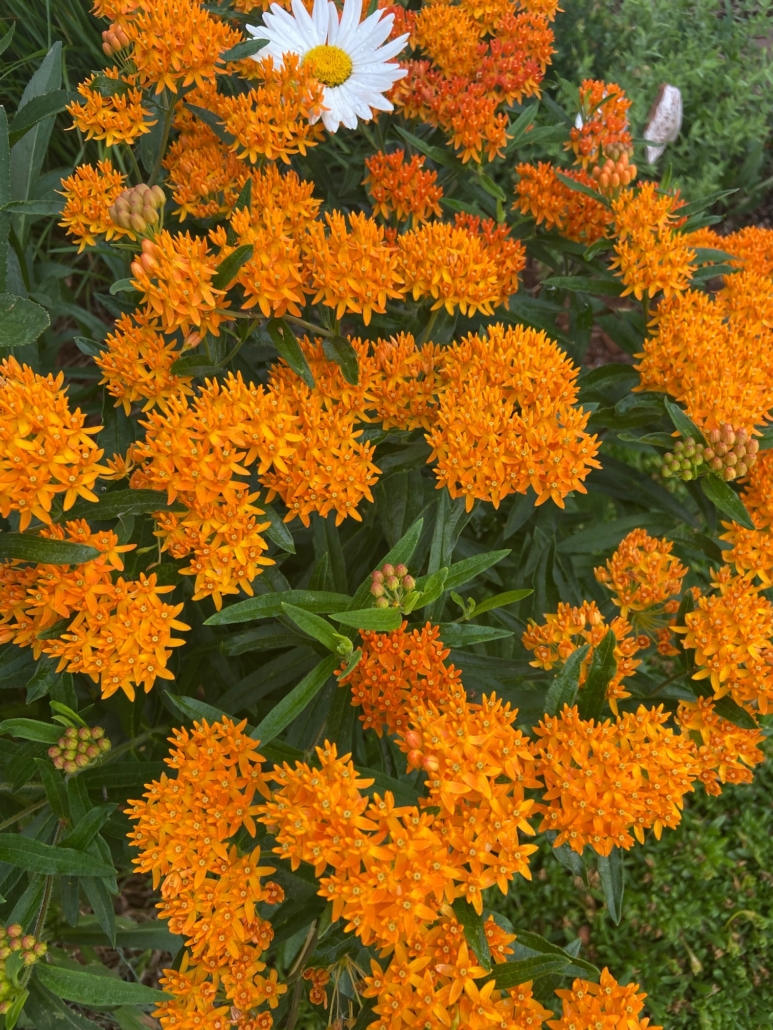 Butterfly Milkweed can only be pollinated by large insects, a trait common among fall wildflowers, and many depend on the survival of specific pollinators. For example; Monarch Butterflies are specific to Butterfly Milkweed and lay their eggs only on the leaves and the larvae feed on the plants. The butterfly can use nectar from other species but must return to the Milkweed to lay eggs. The plant is specifically designed to be pollinated by larger insects. The pollen of Butterfly Milkweed is contained in the pollinium, a heavy sticky structure. Only larger insects can pull the pollinium and themselves from the flowers. There are several nectaries per flower, which increases the chances of finding nectar for multiple pollinators, and multiple flowers per bloom. Note that these plants contain cardiac glycosides, chemicals that are toxic when eaten. These chemicals concentrate in the Monarch caterpillar’s flesh and make them distasteful to any would-be predators.